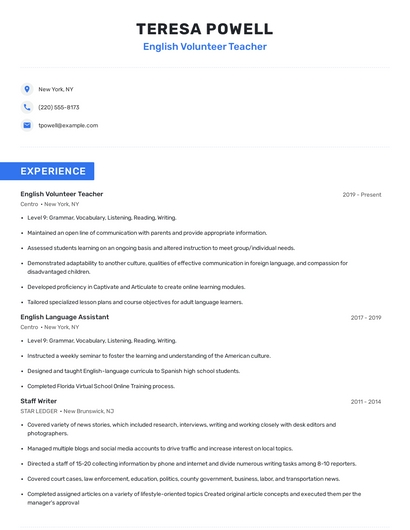 Build a professional english volunteer teacher resume in minutes. Browse through our resume examples to identify the best way to word your resume. Then choose from 5+ resume templates to create your english volunteer teacher resume.