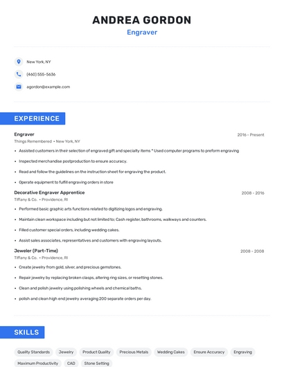 Build a professional engraver resume in minutes. Browse through our resume examples to identify the best way to word your resume. Then choose from 5+ resume templates to create your engraver resume.