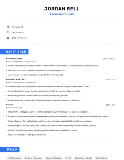 Build a professional enrollment clerk resume in minutes. Browse through our resume examples to identify the best way to word your resume. Then choose from 5+ resume templates to create your enrollment clerk resume.