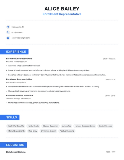 Build a professional enrollment representative resume in minutes. Browse through our resume examples to identify the best way to word your resume. Then choose from 5+ resume templates to create your enrollment representative resume.