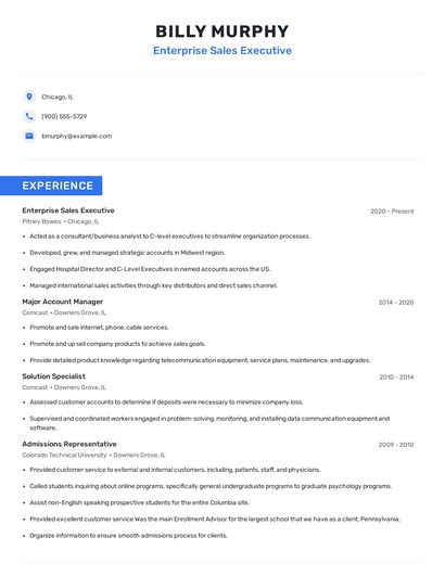 Build a professional enterprise sales executive resume in minutes. Browse through our resume examples to identify the best way to word your resume. Then choose from 5+ resume templates to create your enterprise sales executive resume.