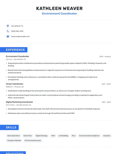 Build a professional environment coordinator resume in minutes. Our AI resume writing assistant will guide you through every step of the process, and you can choose from 10+ resume templates to create your environment coordinator resume.7. Test Cases