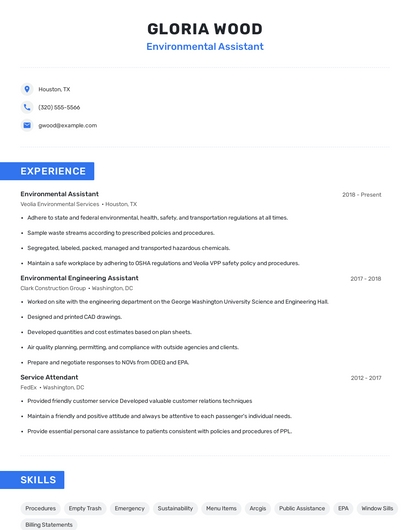 Build a professional environmental assistant resume in minutes. Browse through our resume examples to identify the best way to word your resume. Then choose from 5+ resume templates to create your environmental assistant resume.