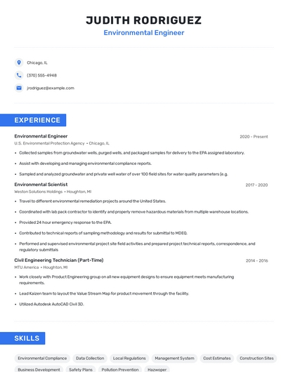 Build a professional environmental engineer resume in minutes. Browse through our resume examples to identify the best way to word your resume. Then choose from 5+ resume templates to create your environmental engineer resume.