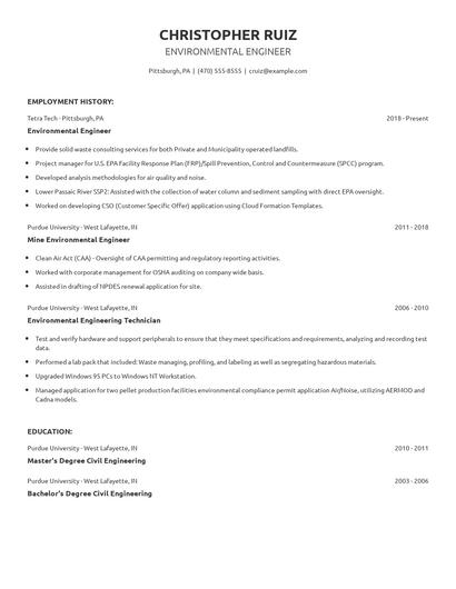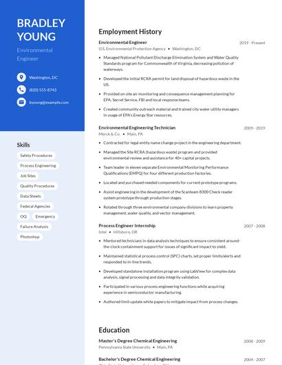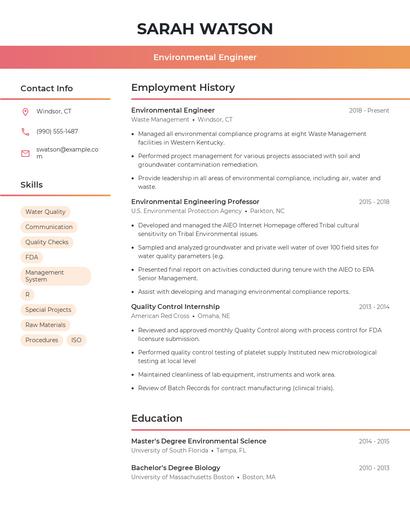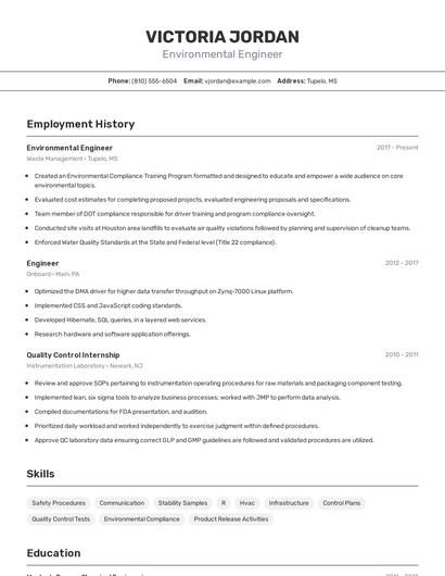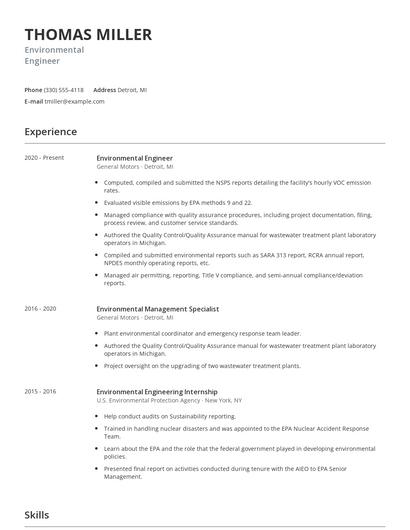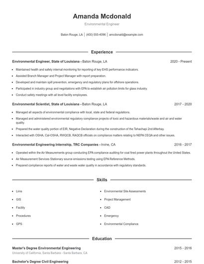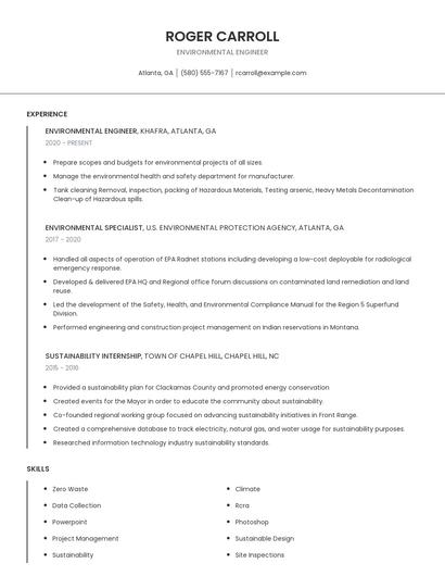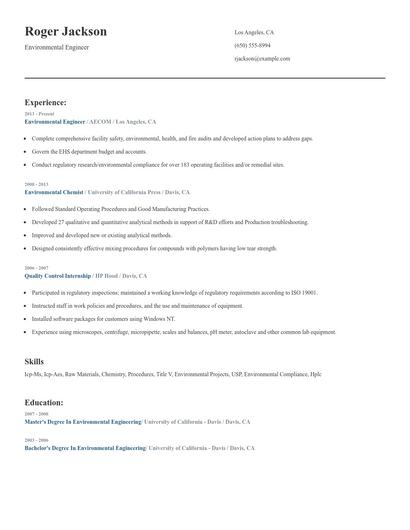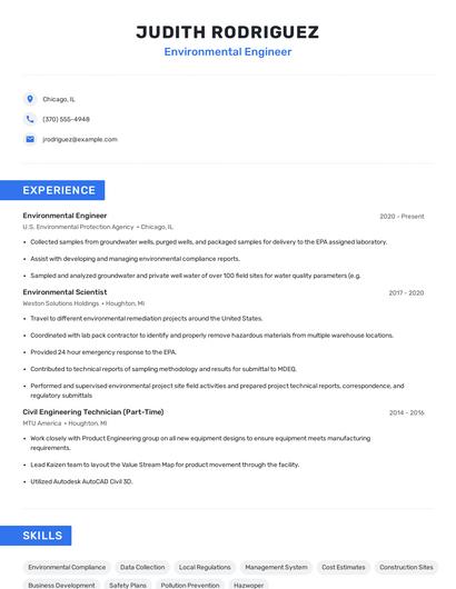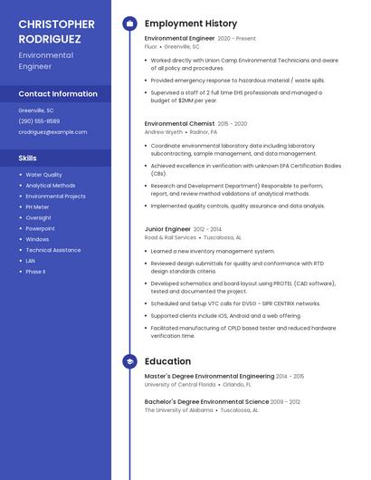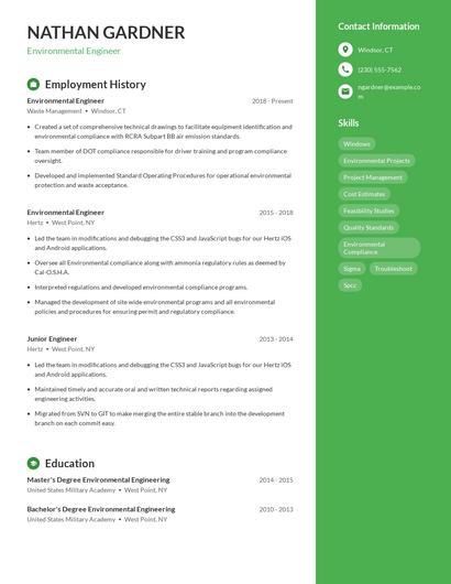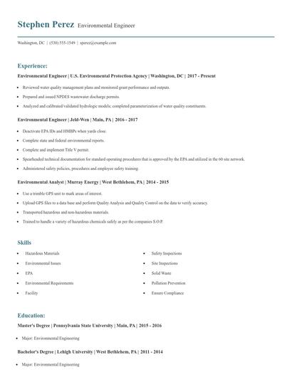Build a professional environmental engineer resume in minutes. Our AI resume writing assistant will guide you through every step of the process, and you can choose from 10+ resume templates to create your environmental engineer resume.Compare different environmental engineers