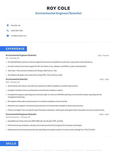 Build a professional environmental engineer/scientist resume in minutes. Browse through our resume examples to identify the best way to word your resume. Then choose from 5+ resume templates to create your environmental engineer/scientist resume.