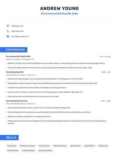 Build a professional environmental health aide resume in minutes. Browse through our resume examples to identify the best way to word your resume. Then choose from 5+ resume templates to create your environmental health aide resume.