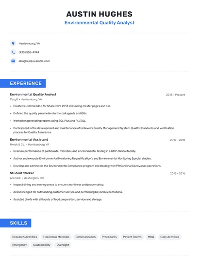 The most important skills for an environmental quality analyst resume and required skills for an environmental quality analyst to have include: