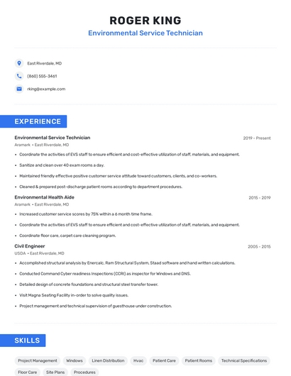 Build a professional environmental service technician resume in minutes. Our AI resume writing assistant will guide you through every step of the process, and you can choose from 10+ resume templates to create your environmental service technician resume.7. Commercial Cleaning