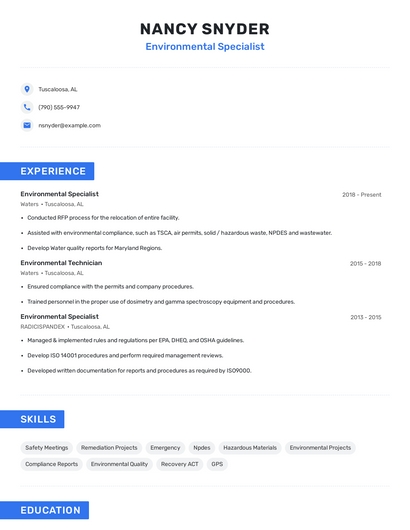 Build a professional environmental specialist resume in minutes. Browse through our resume examples to identify the best way to word your resume. Then choose from 5+ resume templates to create your environmental specialist resume.