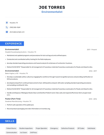 Build a professional environmentalist resume in minutes. Browse through our resume examples to identify the best way to word your resume. Then choose from 5+ resume templates to create your environmentalist resume.