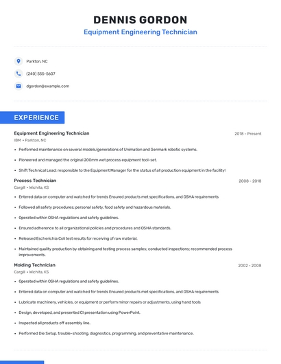 Build a professional equipment engineering technician resume in minutes. Browse through our resume examples to identify the best way to word your resume. Then choose from 5+ resume templates to create your equipment engineering technician resume.