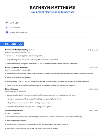 Build a professional equipment maintenance supervisor resume in minutes. Browse through our resume examples to identify the best way to word your resume. Then choose from 5+ resume templates to create your equipment maintenance supervisor resume.