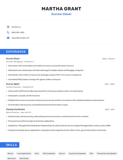 Build a professional escrow closer resume in minutes. Browse through our resume examples to identify the best way to word your resume. Then choose from 5+ resume templates to create your escrow closer resume.