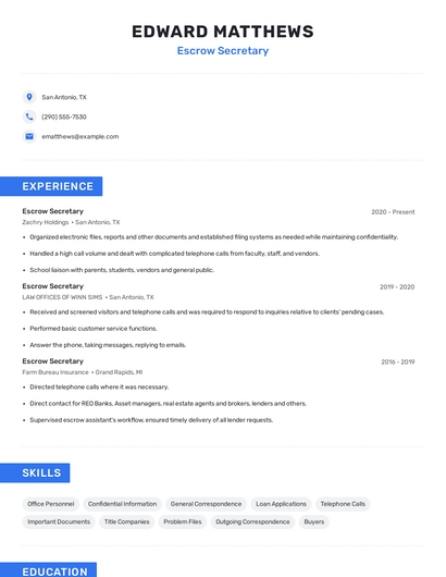 Build a professional escrow secretary resume in minutes. Our AI resume writing assistant will guide you through every step of the process, and you can choose from 10+ resume templates to create your escrow secretary resume.7. Word Processing