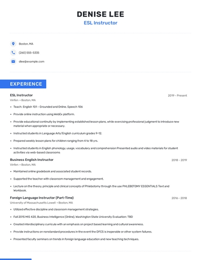 Build a professional esl instructor resume in minutes. Browse through our resume examples to identify the best way to word your resume. Then choose from 5+ resume templates to create your esl instructor resume.