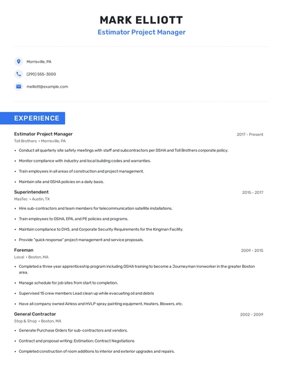 Build a professional estimator project manager resume in minutes. Browse through our resume examples to identify the best way to word your resume. Then choose from 5+ resume templates to create your estimator project manager resume.