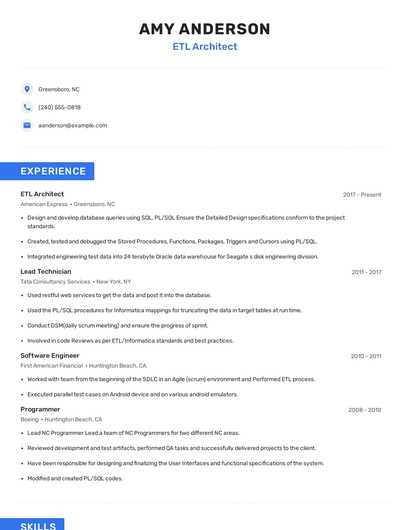 Build a professional etl architect resume in minutes. Browse through our resume examples to identify the best way to word your resume. Then choose from 5+ resume templates to create your etl architect resume.