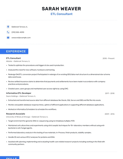 Build a professional etl consultant resume in minutes. Browse through our resume examples to identify the best way to word your resume. Then choose from 5+ resume templates to create your etl consultant resume.