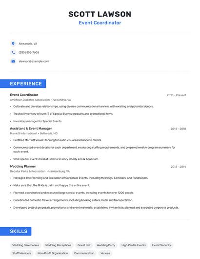 You can use Zippia's AI resume builder to make the resume writing process easier while also making sure that you include key information that hiring managers expect to see on an event coordinator resume. You'll find resume tips and examples of skills, responsibilities, and summaries, all provided by Zippi, your career sidekick.