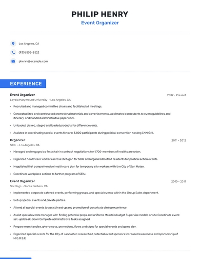 Build a professional event organizer resume in minutes. Browse through our resume examples to identify the best way to word your resume. Then choose from 5+ resume templates to create your event organizer resume.