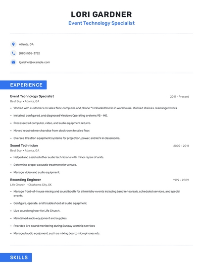 Build a professional event technology specialist resume in minutes. Browse through our resume examples to identify the best way to word your resume. Then choose from 5+ resume templates to create your event technology specialist resume.