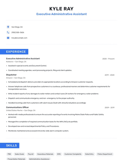 Build a professional executive administrative assistant resume in minutes. Browse through our resume examples to identify the best way to word your resume. Then choose from 5+ resume templates to create your executive administrative assistant resume.