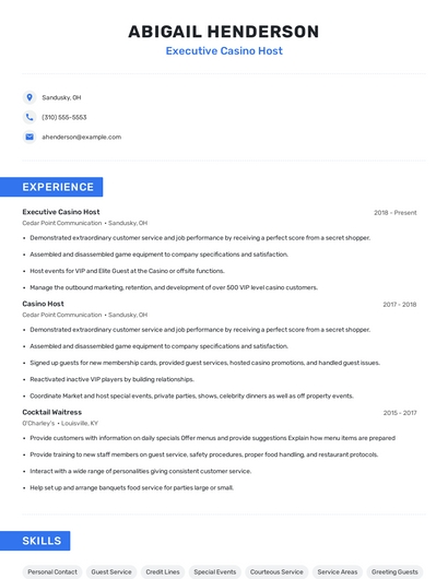 Build a professional executive casino host resume in minutes. Our AI resume writing assistant will guide you through every step of the process, and you can choose from 10+ resume templates to create your executive casino host resume.7. VIP