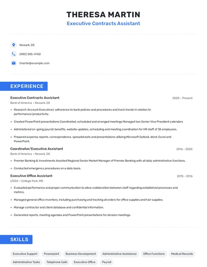 Build a professional executive contracts assistant resume in minutes. Browse through our resume examples to identify the best way to word your resume. Then choose from 5+ resume templates to create your executive contracts assistant resume.