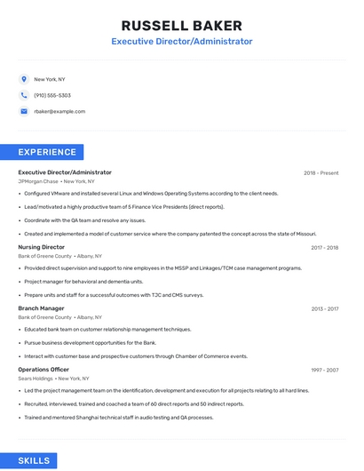 Build a professional executive director/administrator resume in minutes. Browse through our resume examples to identify the best way to word your resume. Then choose from 5+ resume templates to create your executive director/administrator resume.