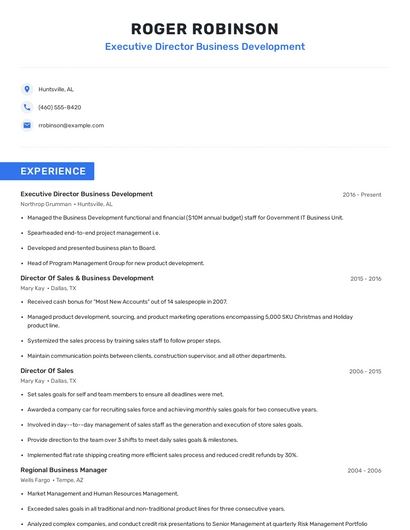 Build a professional executive director business development resume in minutes. Browse through our resume examples to identify the best way to word your resume. Then choose from 5+ resume templates to create your executive director business development resume.