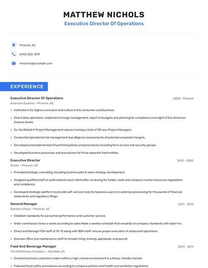 Build a professional executive director of operations resume in minutes. Browse through our resume examples to identify the best way to word your resume. Then choose from 5+ resume templates to create your executive director of operations resume.