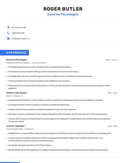 Build a professional exercise physiologist resume in minutes. Browse through our resume examples to identify the best way to word your resume. Then choose from 5+ resume templates to create your exercise physiologist resume.