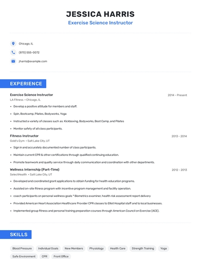 Build a professional exercise science instructor resume in minutes. Browse through our resume examples to identify the best way to word your resume. Then choose from 5+ resume templates to create your exercise science instructor resume.
