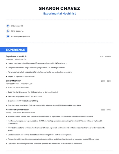 Build a professional experimental machinist resume in minutes. Browse through our resume examples to identify the best way to word your resume. Then choose from 5+ resume templates to create your experimental machinist resume.