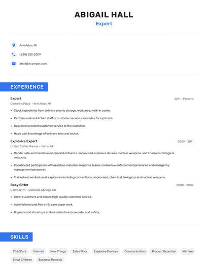 Build a professional expert resume in minutes. Our AI resume writing assistant will guide you through every step of the process, and you can choose from 10+ resume templates to create your expert resume.7. Cleanliness