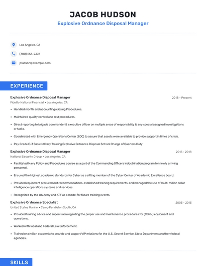 The most important skills for an explosive ordnance disposal manager resume and required skills for an explosive ordnance disposal manager to have include: