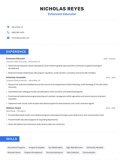 Build a professional extension educator resume in minutes. Browse through our resume examples to identify the best way to word your resume. Then choose from 5+ resume templates to create your extension educator resume.