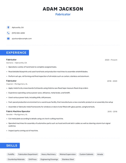 Build a professional fabricator resume in minutes. Browse through our resume examples to identify the best way to word your resume. Then choose from 5+ resume templates to create your fabricator resume.