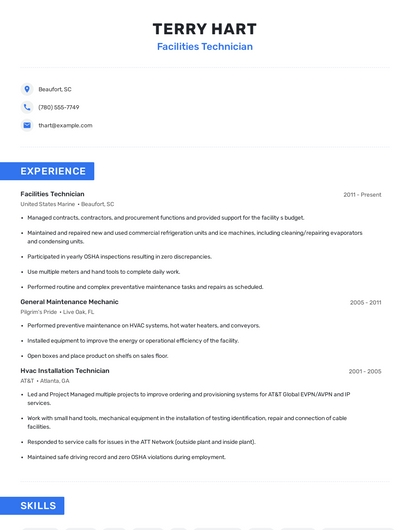 Build a professional facilities technician resume in minutes. Browse through our resume examples to identify the best way to word your resume. Then choose from 5+ resume templates to create your facilities technician resume.