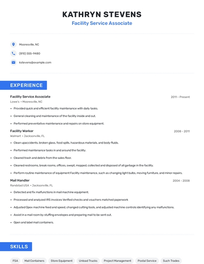 Build a professional facility service associate resume in minutes. Browse through our resume examples to identify the best way to word your resume. Then choose from 5+ resume templates to create your facility service associate resume.