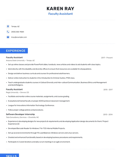 Build a professional faculty assistant resume in minutes. Browse through our resume examples to identify the best way to word your resume. Then choose from 5+ resume templates to create your faculty assistant resume.
