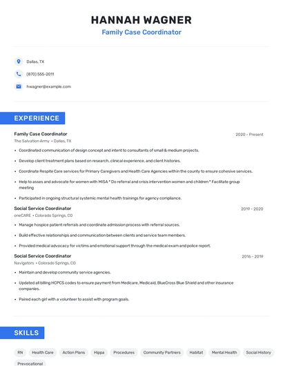 Build a professional family case coordinator resume in minutes. Browse through our resume examples to identify the best way to word your resume. Then choose from 5+ resume templates to create your family case coordinator resume.
