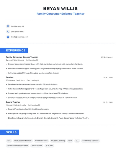 Build a professional family consumer science teacher resume in minutes. Browse through our resume examples to identify the best way to word your resume. Then choose from 5+ resume templates to create your family consumer science teacher resume.