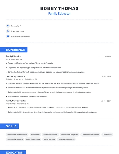 Build a professional family educator resume in minutes. Browse through our resume examples to identify the best way to word your resume. Then choose from 5+ resume templates to create your family educator resume.