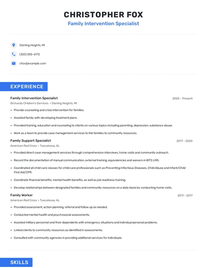 Build a professional family intervention specialist resume in minutes. Browse through our resume examples to identify the best way to word your resume. Then choose from 5+ resume templates to create your family intervention specialist resume.