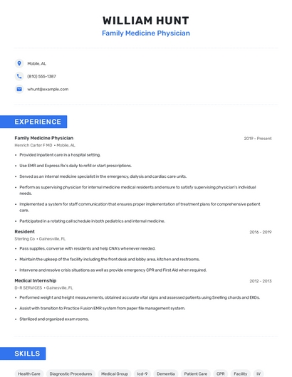 Build a professional family medicine physician resume in minutes. Browse through our resume examples to identify the best way to word your resume. Then choose from 5+ resume templates to create your family medicine physician resume.