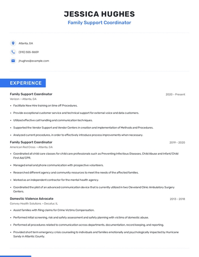 Build a professional family support coordinator resume in minutes. Our AI resume writing assistant will guide you through every step of the process, and you can choose from 10+ resume templates to create your family support coordinator resume.7. Family Support