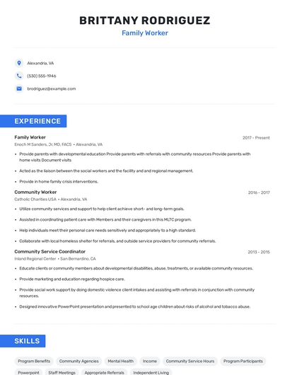 Build a professional family worker resume in minutes. Browse through our resume examples to identify the best way to word your resume. Then choose from 5+ resume templates to create your family worker resume.