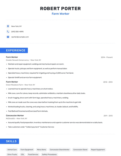 Build a professional farm worker resume in minutes. Browse through our resume examples to identify the best way to word your resume. Then choose from 5+ resume templates to create your farm worker resume.